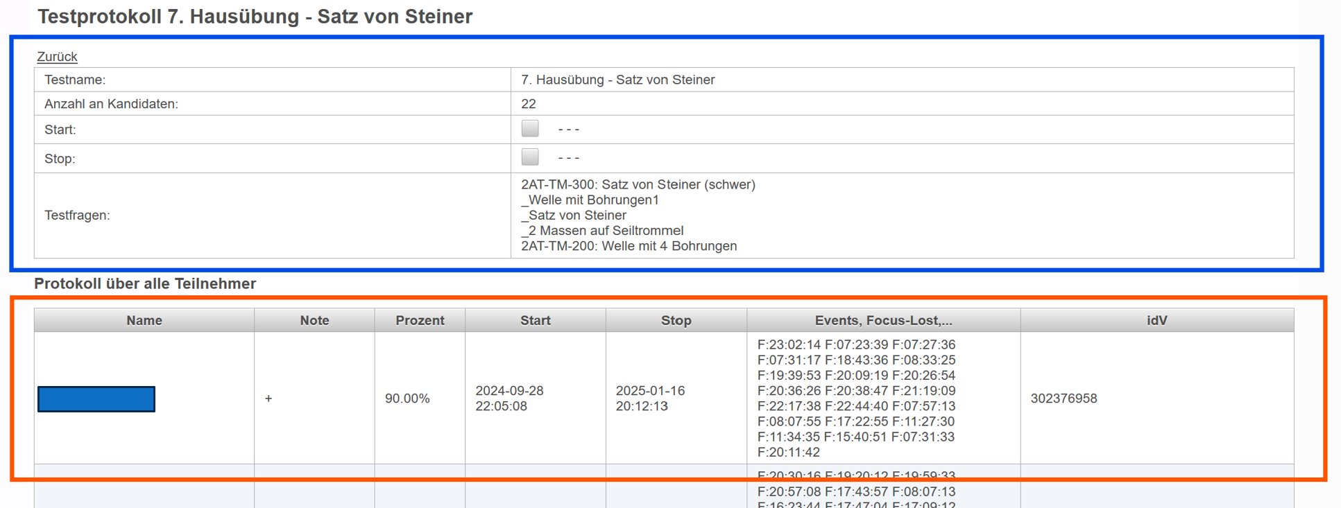 - oranger Bereich: Schülerspezifische Informationen werden aufgelistet. Diese sind: Name, Note, Prozentwert, Start, Stop, Event-Loging