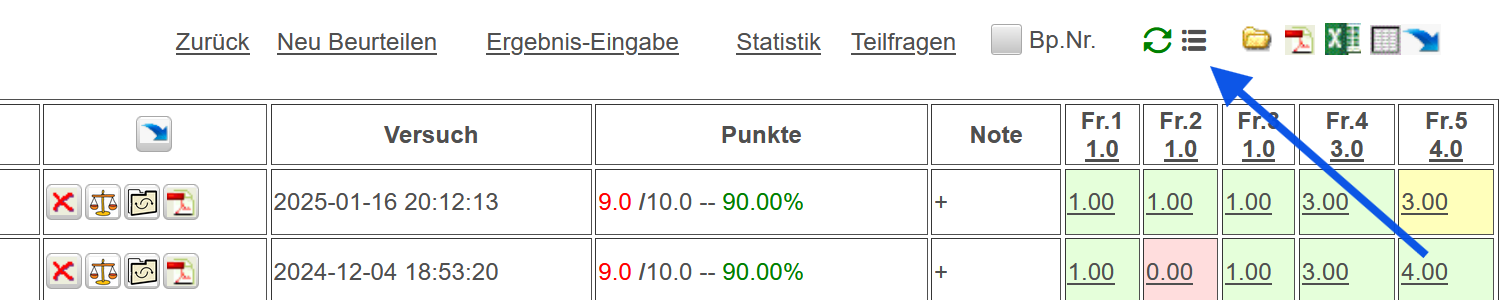 - Für jede Frage eines Online-Tests wird eine eigene Spalte angezeigt: Hier werden die erreichten Punkte für diese Frage dargestellt. Farbliche Hinterlegung für falsch (rot), grün(richtig) und teilweise richtig (gelb). Wird diese Beurteilung vom Lehrer festgelegt, dann erscheint diese in grellerer Farbhinterlegung.